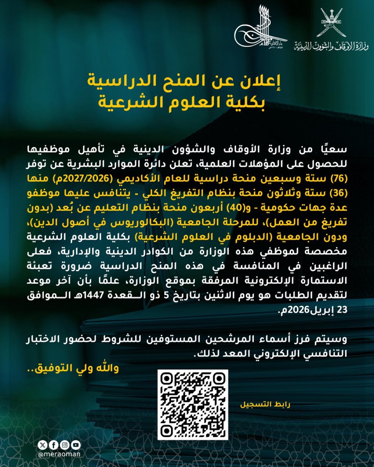 الصحوة – سعيًا من وزارة الأوقاف والشؤون الدينية في تأهيل موظفيها للحصول على المؤهلات العلمية، تعلن دائرة الموارد البشرية عن توفر 76 منحة دراسية للعام الأكاديمي (2027/2026م) منها 36 منحة بنظام التفريغ الكلي – يتنافس عليها موظفو عدة جهات حكومية – و40 منحة بنظام التعليم عن بُعد (بدون تفريغ من العمل)، للمرحلة الجامعية (البكالوريوس في أصول الدين)، ودون الجامعية (الدبلوم في العلوم الشرعية) بكلية العلوم الشرعية مخصصة لموظفي هذه الوزارة من الكوادر الدينية والإدارية، فعلى الراغبين في المنافسة في هذه المنح الدراسية ضرورة تعبئة الاستمارة الإلكترونية المرفقة بموقع الوزارة، علمًا بأن آخر موعد لتقديم الطلبات هو يوم الاثنين بتاريخ 5 ذو القعدة 1447ه الموافق