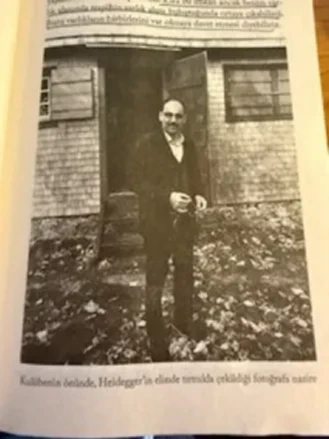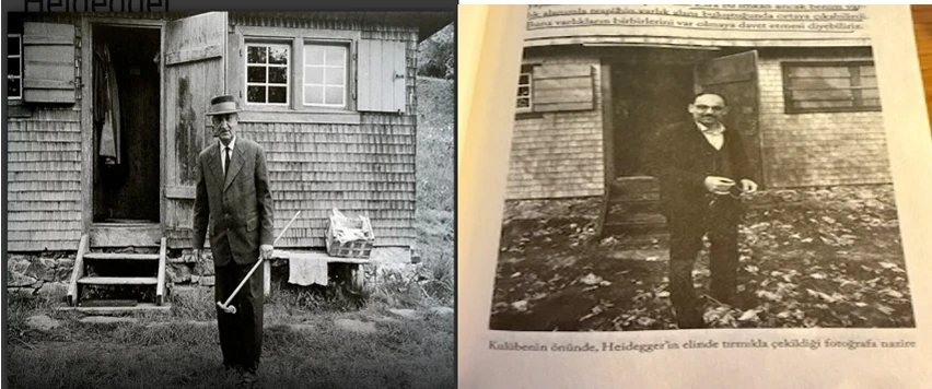Kalın’ın Heidegger’in kulübesi önünde çekilmiş nazire fotoğrafı. Heidegger’in elindeki tırmığa karşılık burada tespihin bulunması ontolojik düşünmeden metafizik tefekküre doğru yapılan yorumlayıcı yolculuğu simgeliyor.