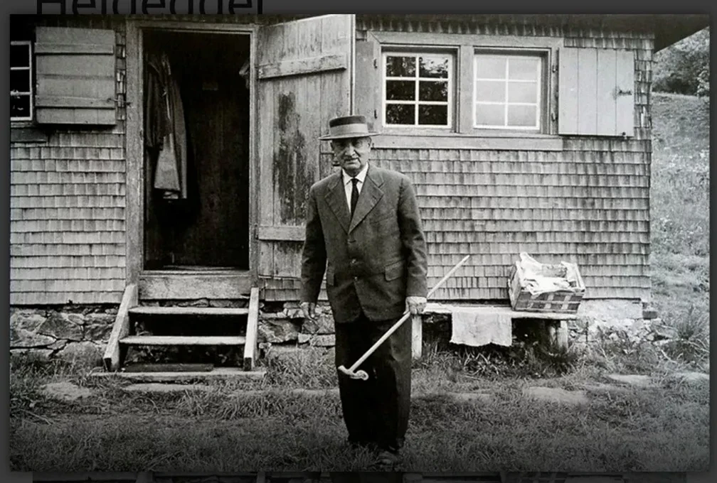 Martin Heidegger Todtnauberg’deki kulübesinin önünde elinde tırmıkla. Bu fotoğraf Heidegger’in düşüncesinde toprağa, mekana ve yaşanan dünyaya bağlı olmanın önemini simgeler. Heidegger için düşünmek soyut bir faaliyet değil varlıkla aynı yerde durabilme çabasıdır.