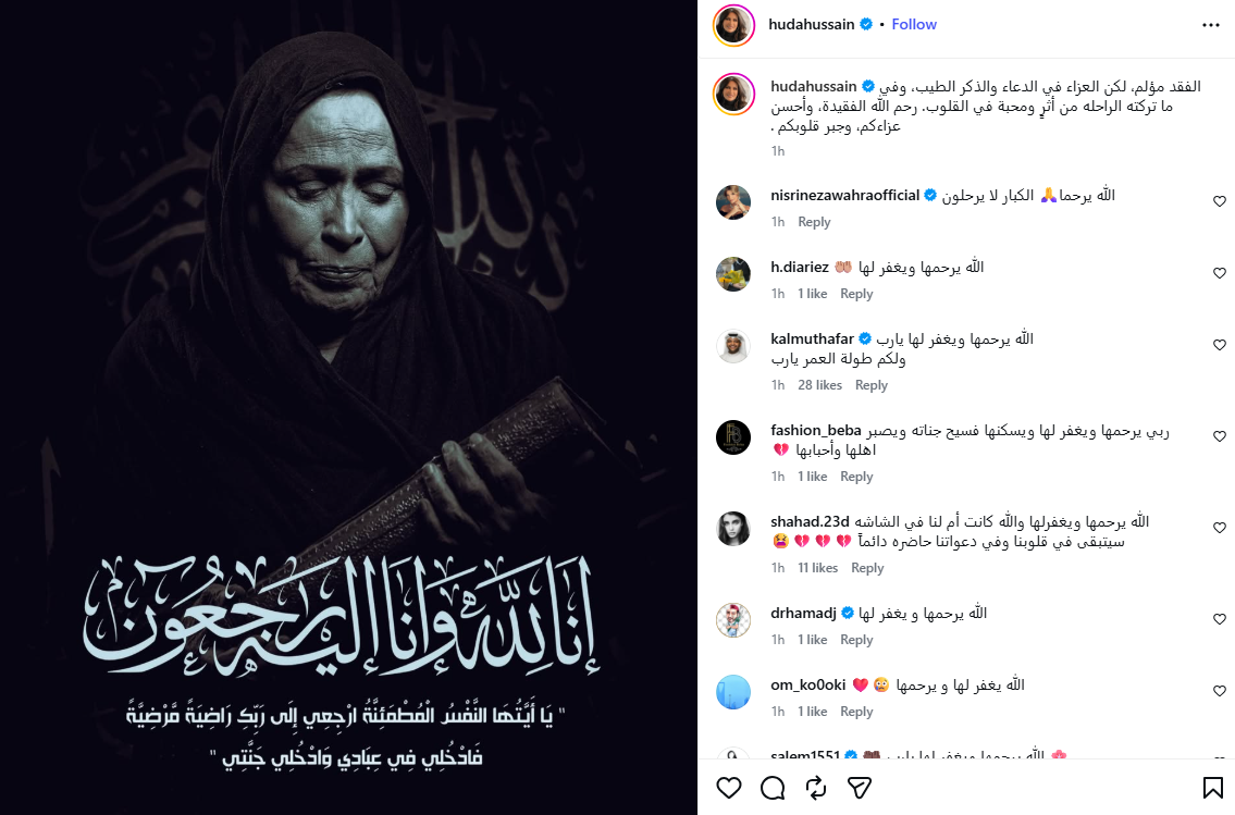 وجاء في منشور الفنانة العراقية هدى حسين: "الفقد مؤلم، لكن العزاء في الدعاء والذكر الطيب، وفي ما تركته الراحله من أثرٍ ومحبة في القلوب. رحم الله الفقيدة، وأحسن عزاءكم، وجبر قلوبكم".