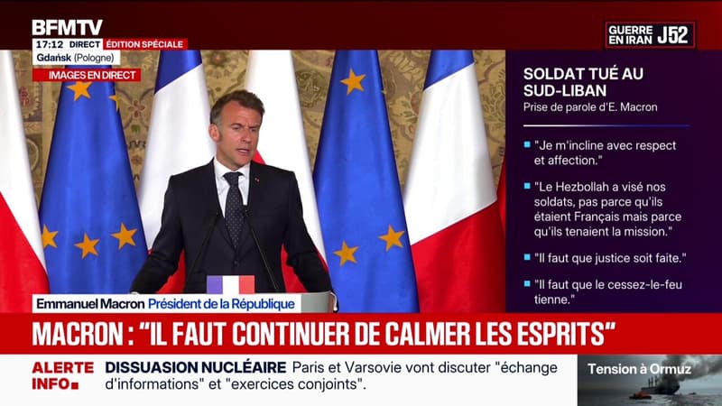 BFM-International"Nous sommes pour la désescalade" dans le détroit d'Ormuz, affirme Emmanuel MacronEmmanuel Macron prend la parole depuis la Pologne ce lundi 20 avrilAujourd'hui à 17h15 | Durée : 0:35PartagerX