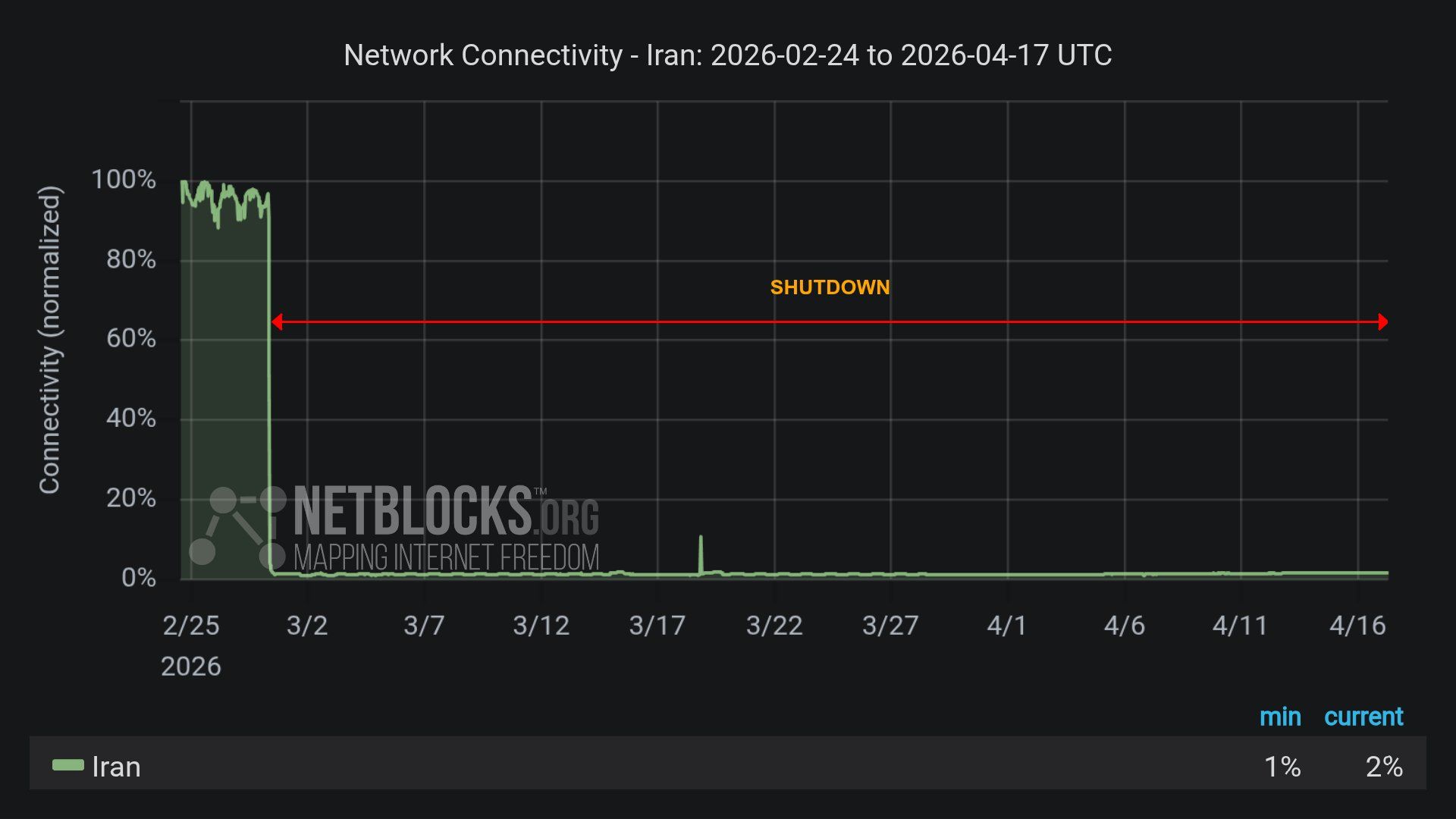 وبسایت نتبلاکس که اختلالهای اینترنتی در جهان را رصد میکند، صبح جمعه، ۲۸ فروردین گزارش داد که قطعی اینترنت در ایران وارد چهلونهمین روز شد و از ۱۱۵۲ ساعت عبور کرد.