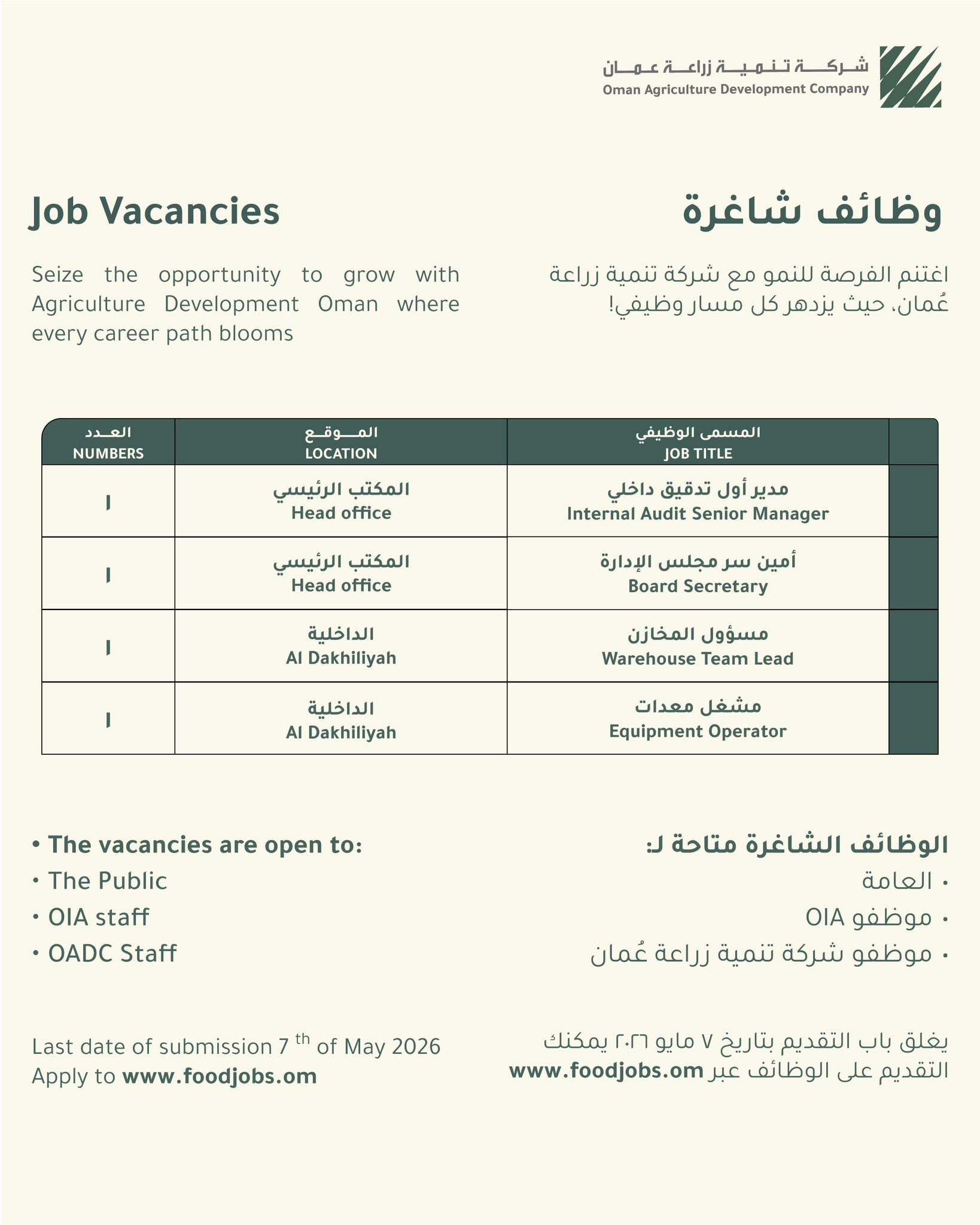 الصحوة – تعلن شركة تنمية زراعة عمان عن توفير عدد من الوظائف الشاغرة .