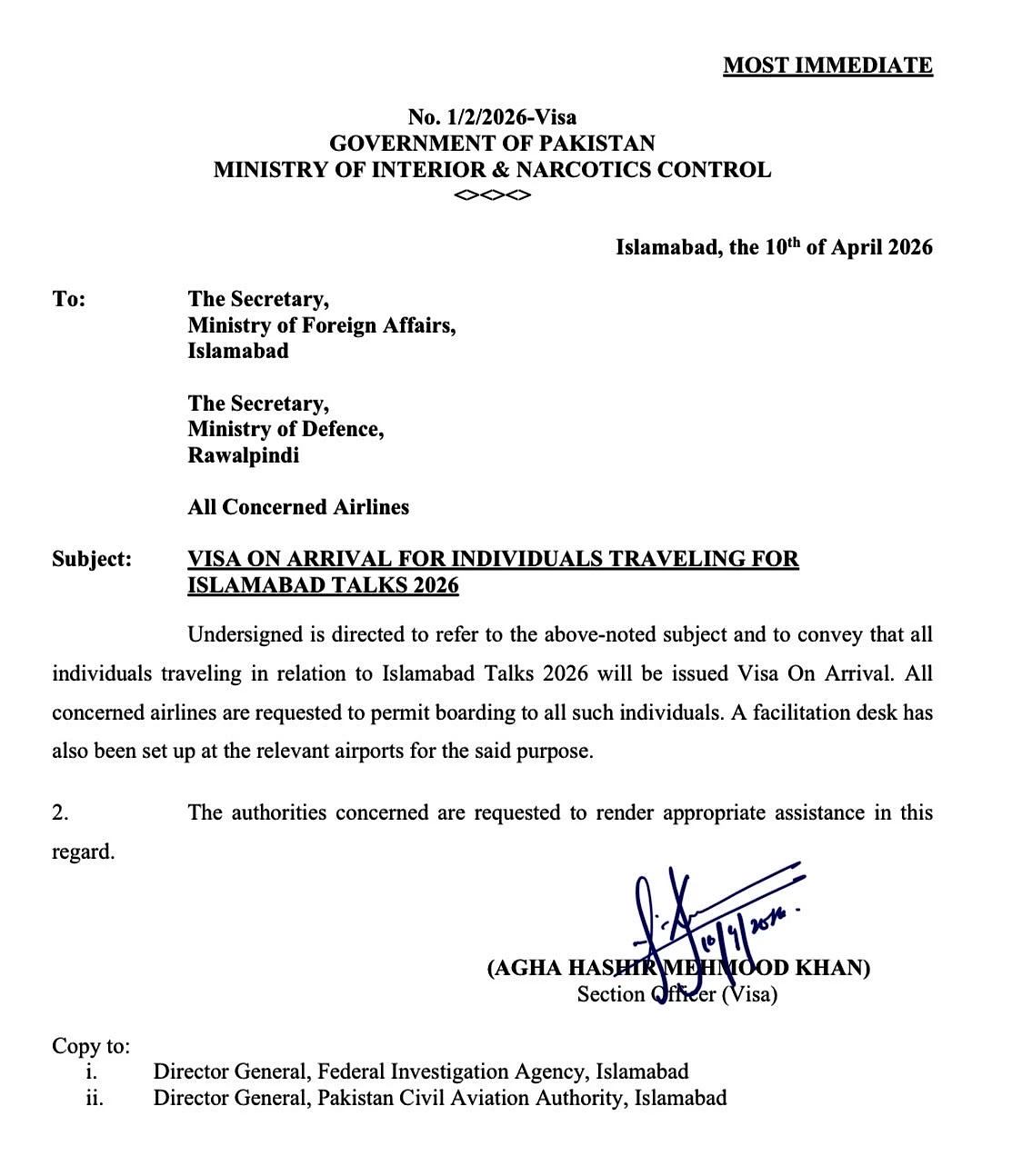 Deputy Prime Minister and Foreign Minister Ishaq Dar stated that airlines have been formally instructed to permit visa-free boarding for individuals travelling to Pakistan in connection with the talks, in order to facilitate their entry.