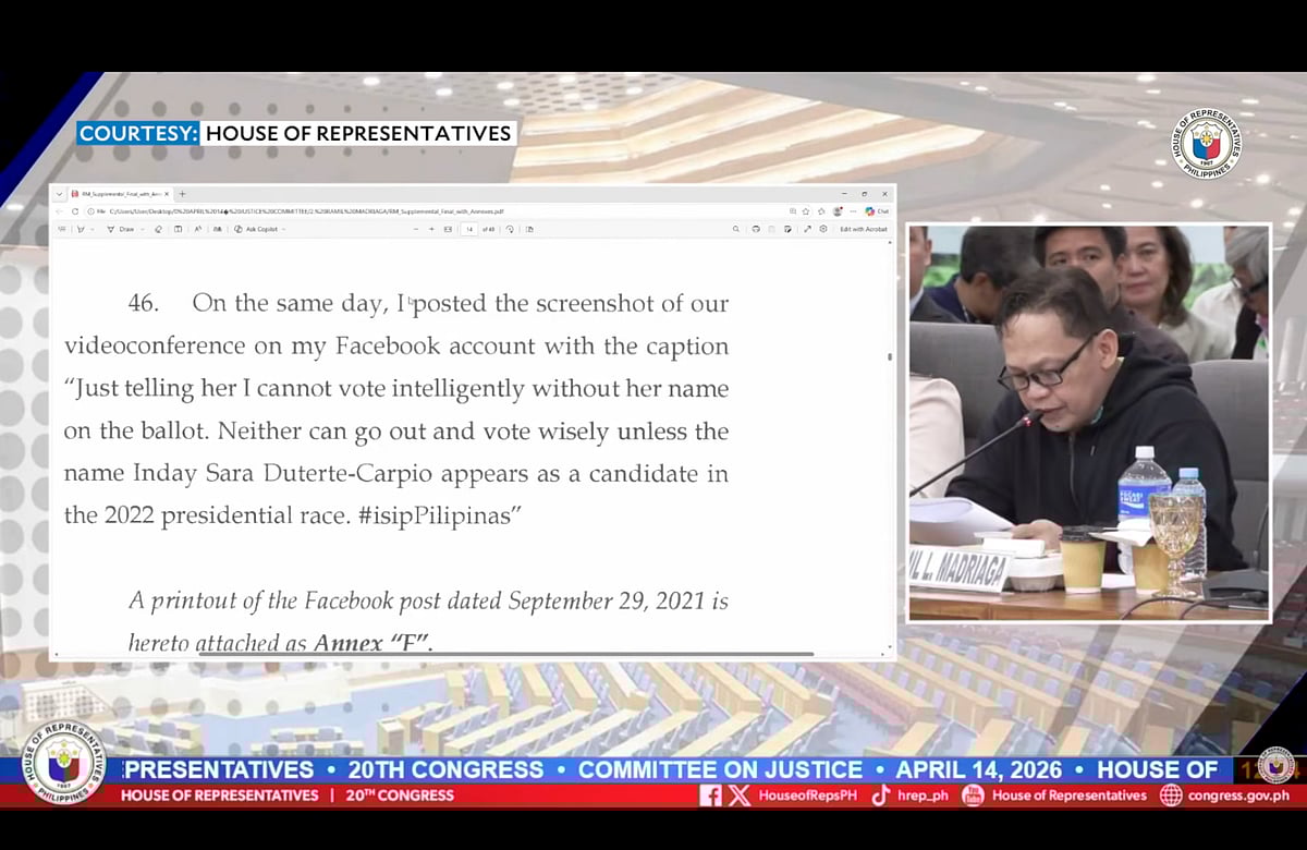 After weeks of anticipation, Madriaga, a former senior aide of Sara Duterte, appeared before the House of Representatives of the Philippines Committee on Justice on Tuesday (April 14, 2026) as impeachment hearings against the Vice President continued at the Batasang Pambansa Complex.