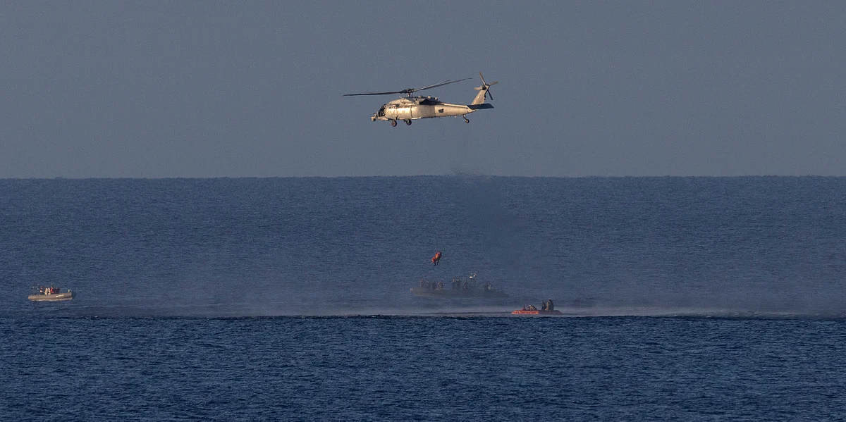 A Navy MH-60 Seahawk from Helicopter Sea Combat Squadron (HSC) 23 lifting Nasa astronaut Christina Koch, Artemis II mission specialist, as teams work to bring the Artemis II crewmembers aboard USS John P. Murtha after they splashed down in the Pacific Ocean off the Coast of California on April 10