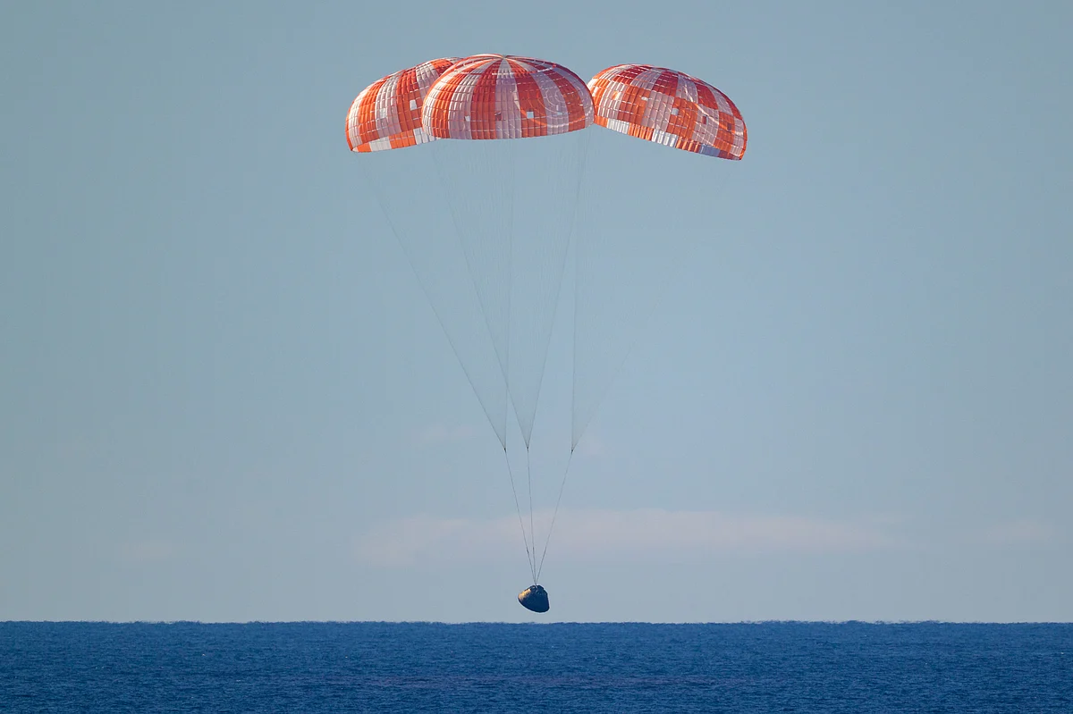 Nasa's Orion spacecraft with Artemis II crewmembers as it lands in the Pacific Ocean off the coast of California