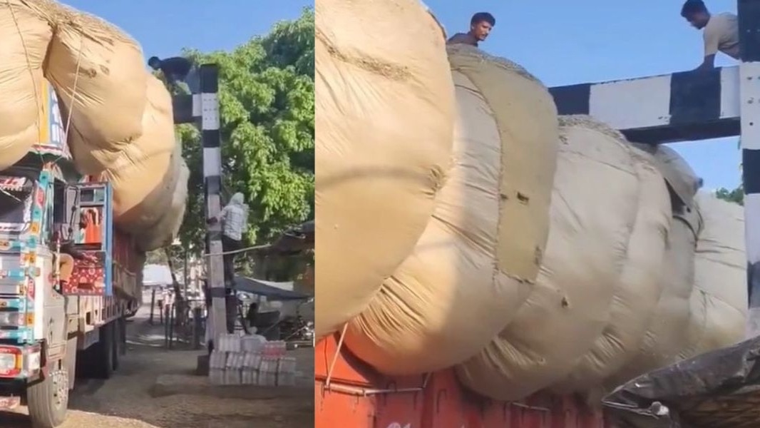 रेलवे क्रॉसिंग पर फंसा ओवरलोड भूसे से भरा ट्रक, लोग बोले- भूसा ट्रक में भरा था या दिमाग में