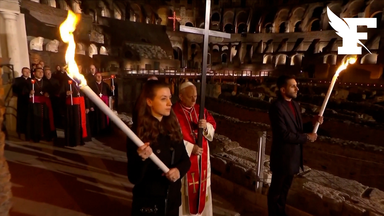 Rome : les images du pape Léon XIV qui porte lui-même la croix au Colisée Par Alexandre Bourcier Le 3 avril 2026 à 22h14 Suivre Sujets Léon XIV Rome Lire dans l’app Copier le lien Lien copié Mail Facebook X Linkedin Messenger WhatsApp Le pape Léon XIV a présidé ce Vendredi saint le chemin de croix au Colisée, à Rome, portant lui‑même la croix à chacune des quatorze stations. Passer la publicité Passer la publicité Publicité Pour son premier Vendredi saint comme souverain pontife, le pape Léon XIV a présidé ce vendredi soir le traditionnel chemin de croix au Colisée, à Rome. Sous les arches illuminées de l’amphithéâtre antique, le pontife n’a pas seulement présidé le chemin de croix : il a choisi d’en assumer lui‑même la charge, portant la croix à chacune des quatorze stations, au milieu d’une foule compacte et silencieuse. À découvrir PODCAST - Écoutez le club Le Figaro International Ce geste, présenté par le Vatican comme un «signe fort» du nouveau pontificat, n’avait plus été accompli dans son intégralité par un pape depuis la reprise de cette cérémonie au XXe siècle. À chaque étape, lectures de l’Évangile, méditations écrites par le franciscain Francesco Patton et prières alternaient avec des moments de silence et de chants, dans une atmosphère de recueillement. Les images du pape avançant lentement, croix sur l’épaule, au cœur du Colisée, sous les lumières et les torches, sont appelées à devenir l’un des symboles marquants de ce début de Semaine sainte.