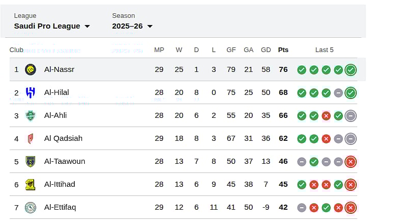 Five games remain, including a crucial Riyadh derby against Al Hilal. The title is firmly in Al Nassr’s hands with a seven point lead, although Hilal still have a game in hand.