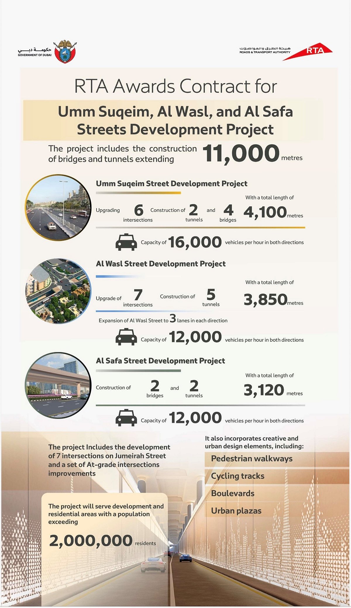 Al Safa Street will also see major enhancements over a 1.5-kilometre stretch, including two bridges and two tunnels extending 3.12 kilometres. Travel time along the corridor will drop from 12 minutes to just three minutes, while capacity will double to 12,000 vehicles per hour.