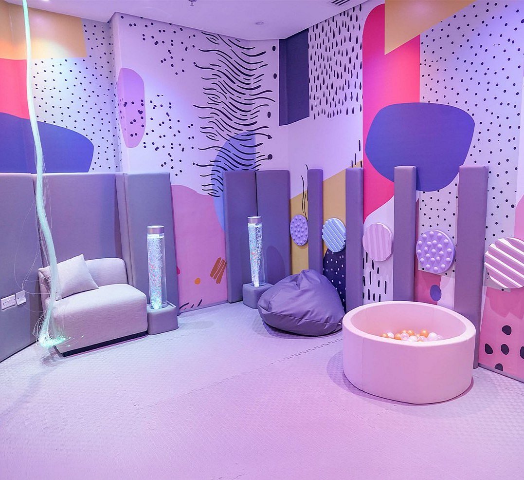 They are purpose-designed environments that balance relaxation and stimulation according to the needs of children with autism. They feature soothing elements including smart low-level lighting and interactive elements such as swings that support physical comfort. The rooms also incorporate audio-visual effects, including calming music, natural scenes, and colourful visuals, helping to reduce sensory stress.