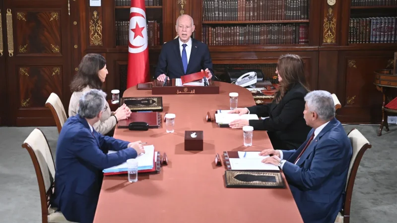أشرف رئيس الجمهوريّة قيس سعيّد أمس الاثنين 27 أفريل 2026 على اجتماع ضمّ كلاّ من سارة الزعفراني الزنزري رئيسة الحكومة ومشكاة سلامة الخالدي.