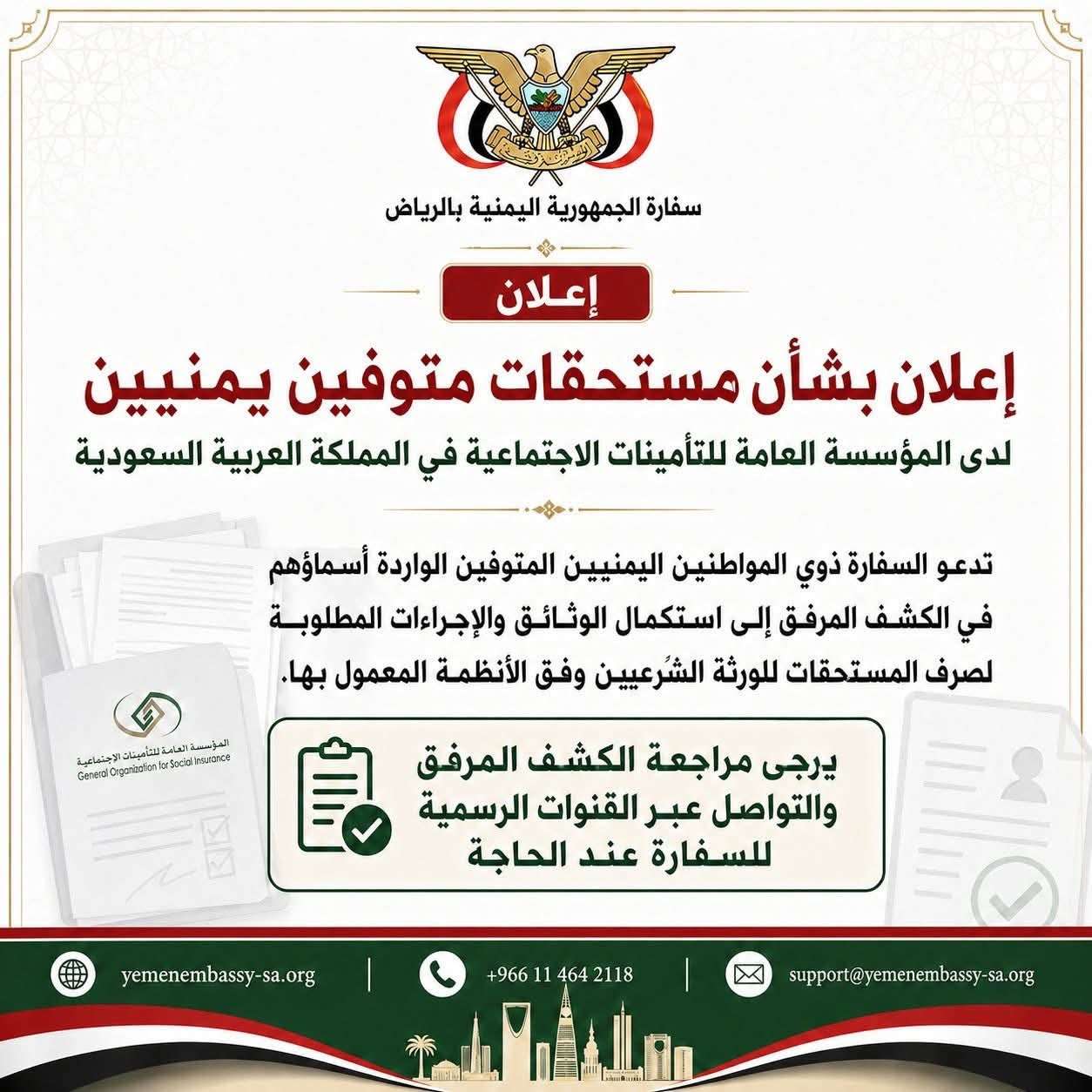 السفارة اليمنية بالرياض تدعو ذوي المتوفين لاستكمال إجراءات مستحقاتهم لدى "التأمينات السعودية"
