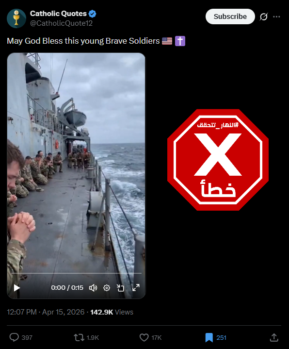فالبحث عن المقطع، بتجزئته الى صور ثابتة (Invid)، يوصلنا اليه منشورا اولا في حساب spectacularsights@ في تيك توك، في 9 نيسان 2026، مع تعليق: "يقفون على متن السفينة، بعضهم ثابتون بينما يجثو آخرون، غارقين في لحظة لا يسمعها أحد سواهم. لا كلمات تُنطق. فقط أفكار وصلوات وكل ما يخفونه في دواخلهم. يمتد المحيط بلا نهاية أمامهم، لكن للحظة، ينصبّ كل تركيزهم على ذواتهم...".