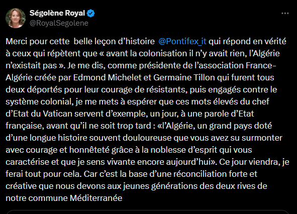 وأعربت سيغولين روايال، في منشور لها عبر منصة “إكس” عن شكرها لما وصفته “بالدرس التاريخي الجميل”، الذي يرد بصدق على من يردّدون أن الجزائر لم تكن موجودة قبل الاستعمار. مضيفة أن كلمات رئيس دولة الفاتيكان تمثل نموذجا يحتذى به. ومعربة عن أملها في أن ينعكس ذلك في خطاب رسمي من قبل الحكومة الفرنسية قبل فوات الأوان.