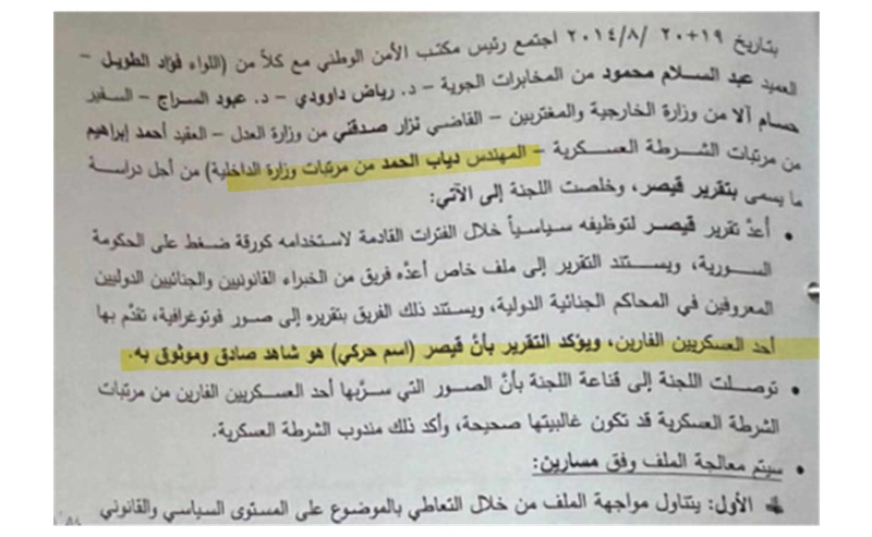 وتُظهر وثيقة مسربة تعود إلى آب/أغسطس 2014 أن اسمه ورد ضمن اجتماع أمني جمع ضباطًا ومسؤولين من أجهزة الاستخبارات ووزارات الداخلية والخارجية والعدل، وكان مخصَّصًا لوضع خطة للتعامل مع ملف "قيصر".
