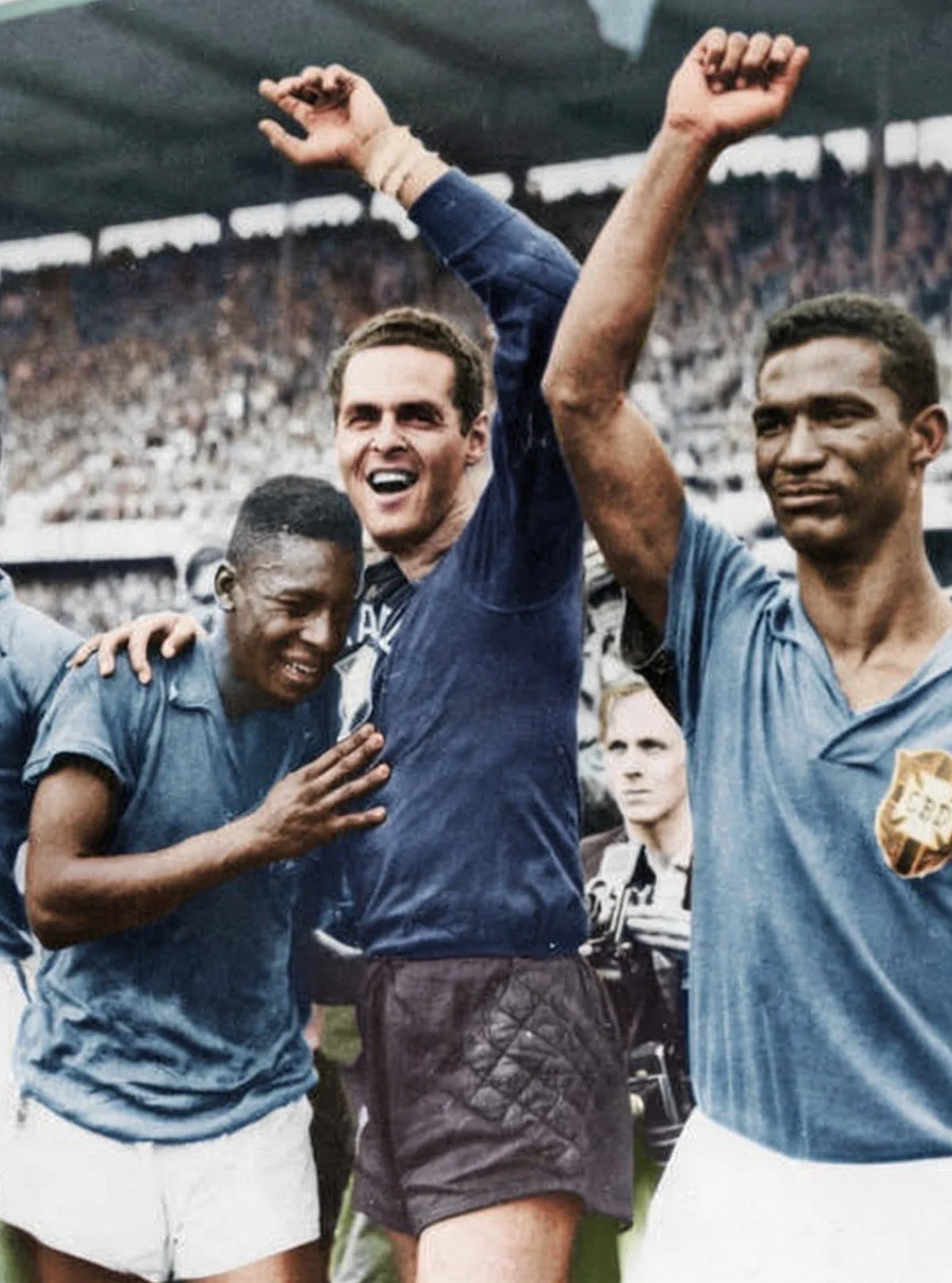 Pele (left) cries after Brazil won the 1958 World Cup final.