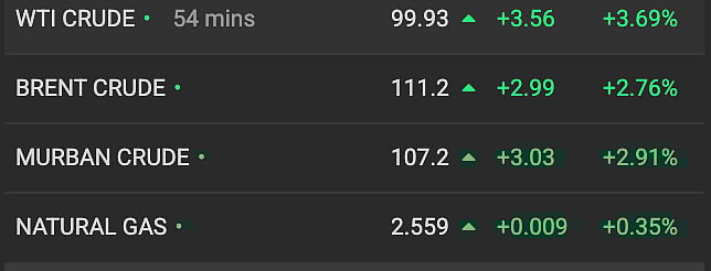 Murban, a Gulf crude benchmark stood at $107.2, 2.91% higher while Natural Gas also inched 0.35% to $2.559.