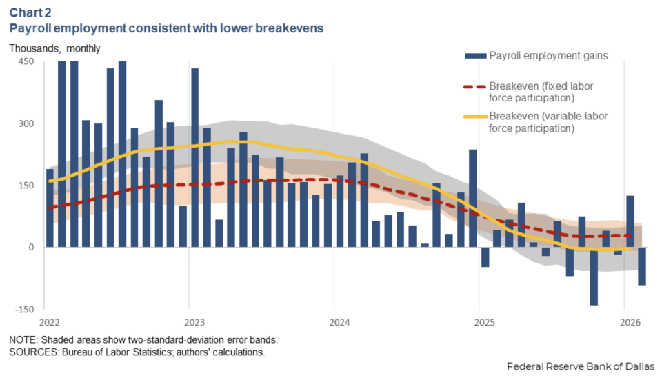 “Real-time data point to an important change in the U.S. labor market: The benchmark for evaluating payroll growth has moved significantly,” the Dallas Fed economists said. “As net outflows of unauthorized immigrants reduced employment growth in late 2025, payroll gains that might historically have signaled economic slack are now consistent with a balanced labor market.”