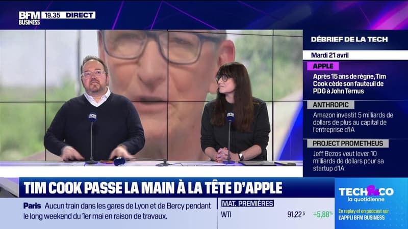 Ce mardi 21 avril, Frédéric Simottel a reçu Michel Levy Provençal, fondateur de TEDxParis et de l'agence Brightness, Cédric Ingrand, directeur général de Heavyweight Studio, et Fanny Bouton, directrice du quantique chez OVHCloud. Ils sont revenus sur le départ de Tim Cook chez Apple, qui passerait la main en septembre prochain à John Ternus, dans l'émission Tech & Co, la quotidienne, sur BFM Business. Retrouvez l'émission du lundi au jeudi et réécoutez la en podcast.