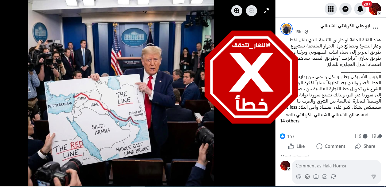يتداول مستخدمون على مواقع التواصل الاجتماعي صورة للرئيس الأميركي دونالد ترامب، مع ادعاء أنه "أعلن رسمياً إطلاق مشروع الخط الأحمر، الذي يهدف إلى تحويل خط التجارة العالمية من مضيق هرمز إلى سوريا". إلا أن هذا الادعاء غير صحيح. FactCheck#