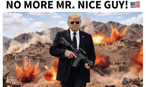 وأرفق ترامب المنشور بصورة له وهو يرتدي نظارات شمسية ويحمل مدفعاً رشاشاً، والدمار خلفه في أحد مدن إيران. وحملت الصورة عبارة "لا مزيد من الرجل اللطيف"، أو "عهد الرجل اللطيف انتهى".