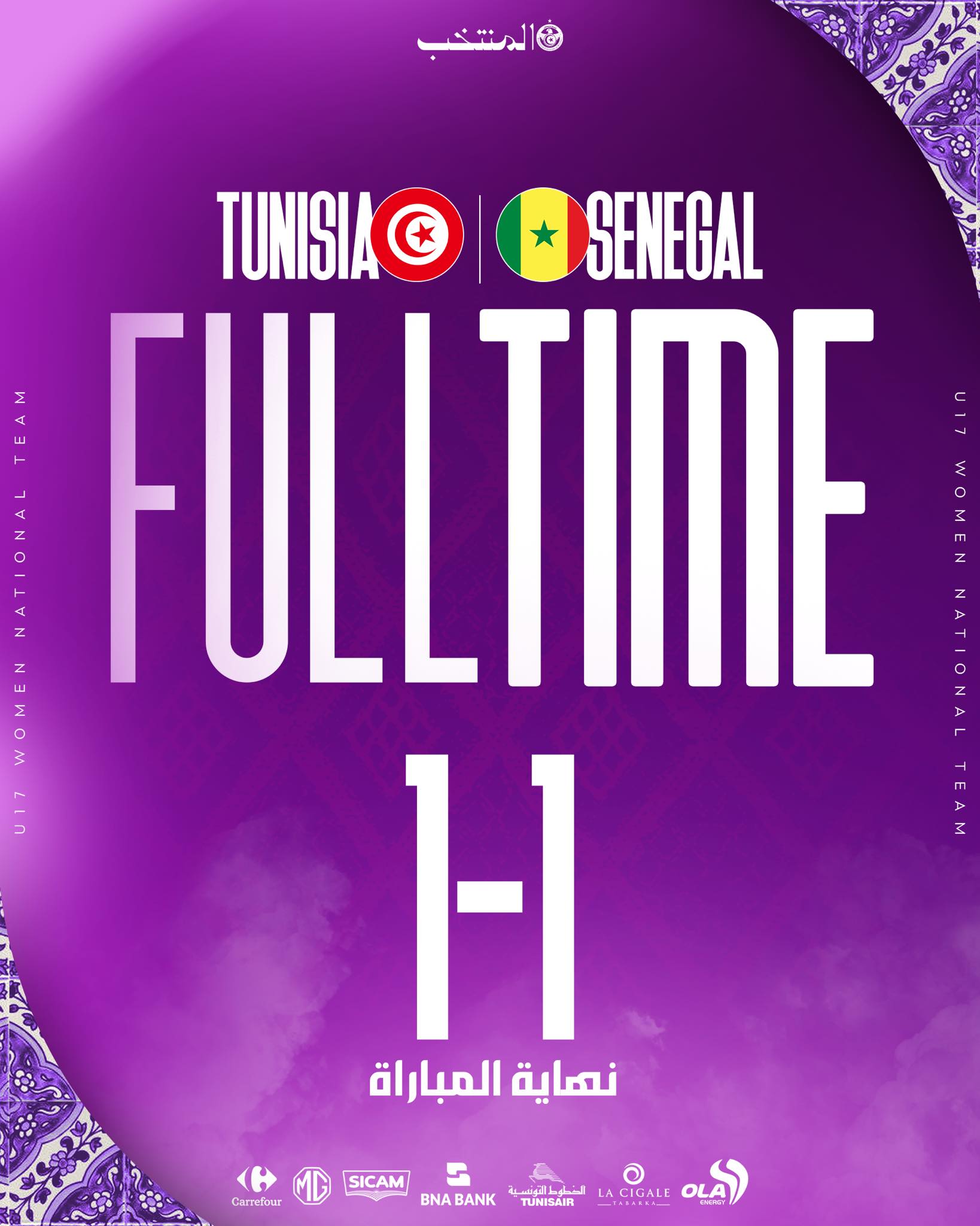 تعادل المنتخب التونسي لكرة القدم سيدات تحت 17 سنة اليوم السبت مع ضيفه السينغالي بنتيجة 1 - 1 لحساب ذهاب الدور الأول من التصفيات الافريقية المؤهلة لكأس العالم.