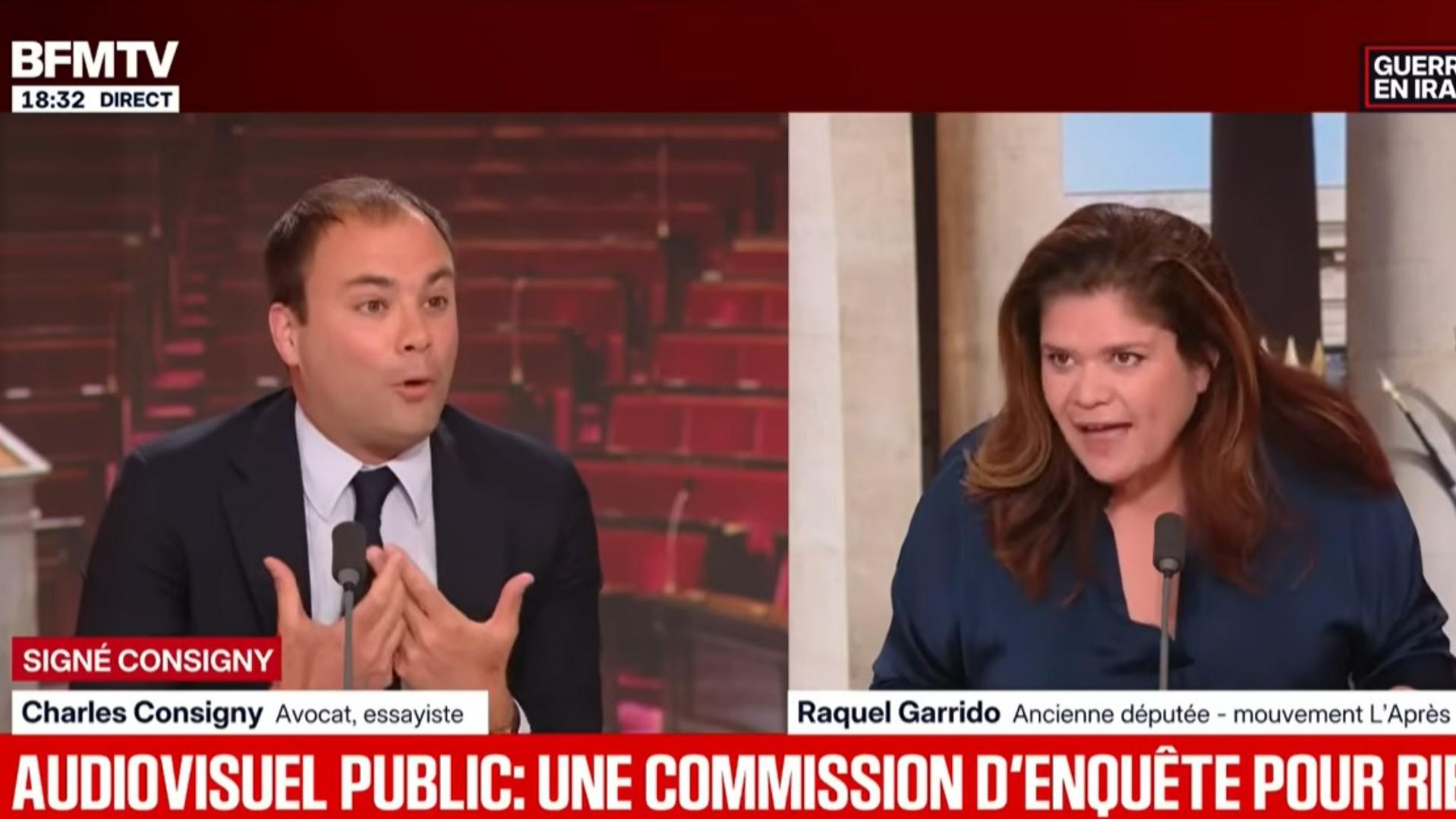 «Vous avez vu la maison de Nagui à Saint-Tropez ?» : Charles Consigny sort de ses gonds face à Raquel Garrido Par Emmanuelle Litaud Le 28 avril 2026 à 10h00 Sujets Raquel Garrido Charles Consigny BFMTV Sauvegarder Nouvelle fonctionnalité ! Avec votre compte, vous pouvez désormais sauvegarder des articles pour les lire plus tard sur tous vos appareils. Sauvegarder Fermer Sauvegarder un article Pour sauvegarder un article vous devez être connecté, vous pourrez ainsi les consulter sur tous vos appareils. Créer un compte Se connecter Copier le lien Lien copié Mail Facebook X Linkedin Messenger WhatsApp Charles Consigny face à Raquel Garrido sur BFMTV. Capture d'écran Sur BFMTV, l’éditorialiste a laissé parler sa colère concernant la commission d’enquête sur l’audiovisuel public en donnant notamment son avis sur les producteurs. Passer la publicité Passer la publicité Publicité La question de la publication du rapport de la commission d’enquête sur l’audiovisuel public était au cœur de l’actualité au soir de ce lundi 27 avril. Une heure avant l’annonce de l’adoption de ce dernier par les membres de la commission, Charles Consigny débattait sur ce sujet face à Raquel Garrido. Une confrontation qui avait lieu dans le cadre de «Signé Consigny» qui a lieu chaque soir à 18 heures sur BFMTV. Alain Marschall, aux commandes de la tranche de la chaîne d’information, a introduit cette conversation. À découvrir Inscrivez-vous à notre newsletter Programmes TV TV ce soir : notre sélection du jour « Les députés votent en ce moment. (...) Est-ce qu’il faut publier ce rapport ? Est-ce qu’il faut l’enterrer ? Est-ce qu’il est utile ? », a questionné le journaliste avant de s’adresser à l’éditorialiste et à l’ancienne députée de La France Insoumise, cofondatrice du mouvement L’après. « Je soutiens pleinement les travaux du député Alloncle dans cette histoire, a commencé Charles Consigny. Je pense que sa commission d’enquête a mis au jour un certain nombre de dériv...