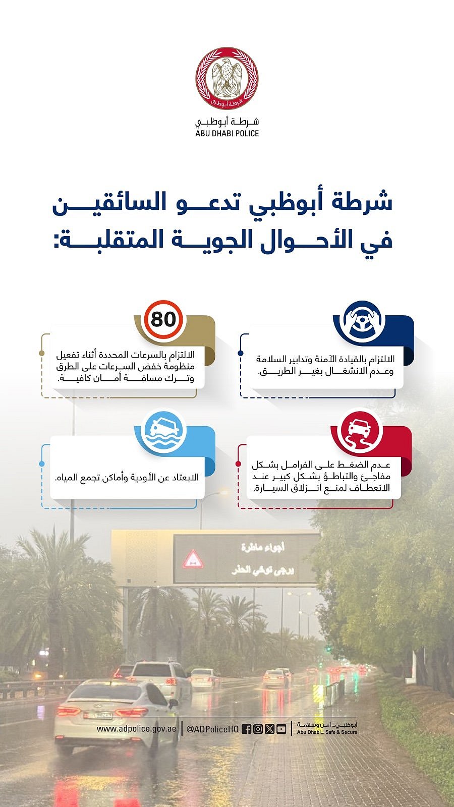 Abu Dhabi Police urged drivers to remain cautious on the roads, advising adherence to variable speed limits displayed on electronic signs and gantries during changing weather conditions.