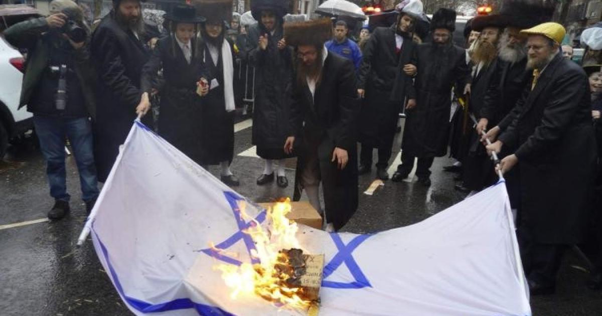 مزق يهود متدينون متشددون من (الحريديم) أعلام إسرائيل عشية إحياء "يوم هازيكارون" يوم الذكرى، والذي يتم فيه إحياء ذكرى من قتلوا من اليهود في الحروب الإسرائيلية.