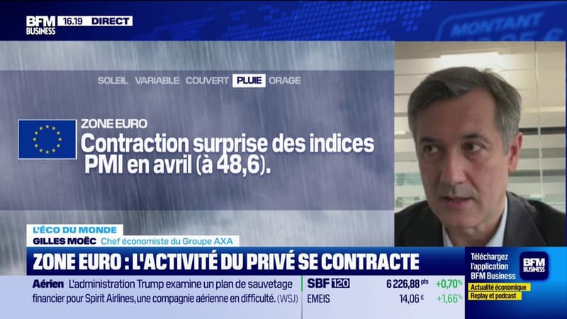 Gilles Moec revient sur l'indice PMI, qui se contracte plus que prévu. Il explique cette baisse plus forte, notamment par la guerre au Proche Orient, qui dégrade les prix de l'énergie et donc de l'activité économique.