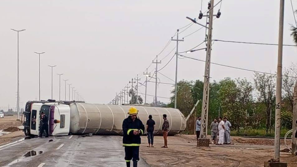 الغاز والسائق بخير.. انقلاب صهريج حكومي ممتلئ قبل وصوله الفاو (صور)