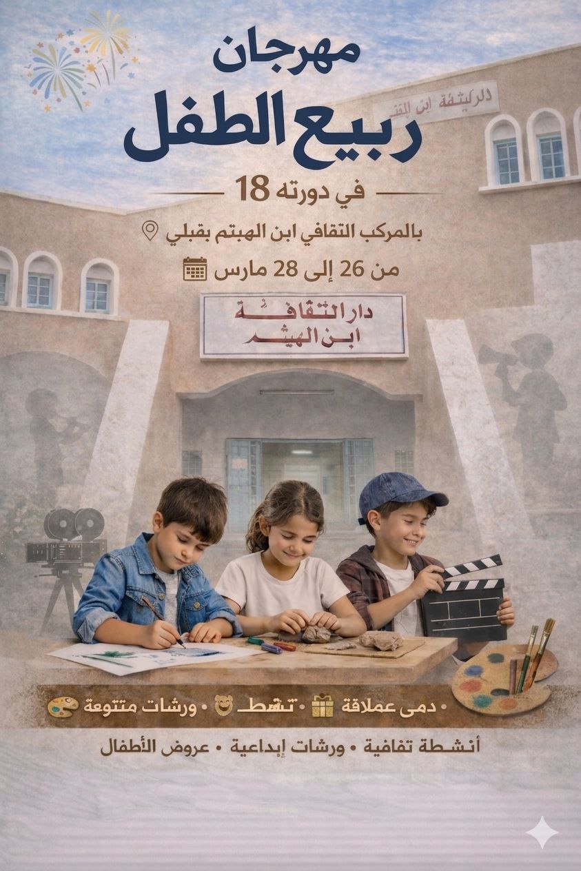 قبلي: الدورة 18 لمهرجان ربيع الطفل بالمركب الثقافي ابن الهيثم من 26 الى 28 مارس الجاري