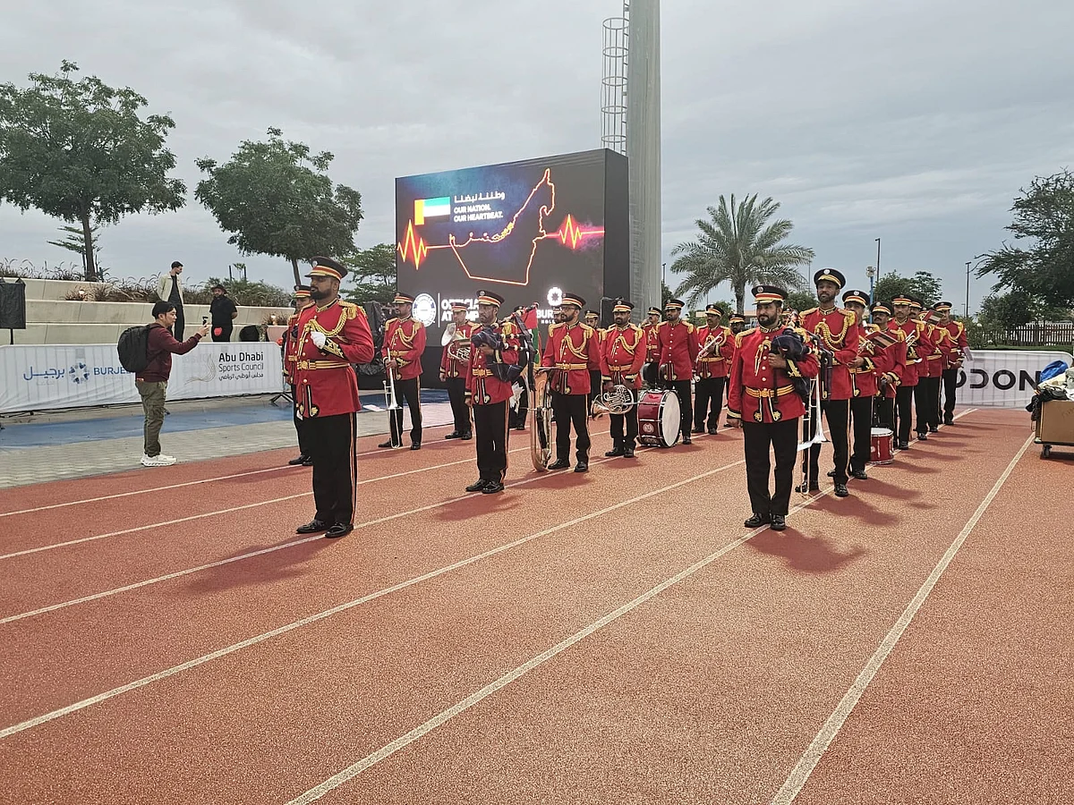 A marching band from Abu Dhabi Police in ceremonial uniforms set the tone for the event, while a large screen displaying the UAE map and a heartbeat graphics.