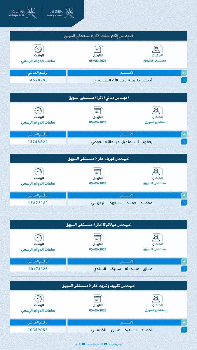 الصحوة – أعلنت وزارة الصحة، بالتنسيق مع وزارة العمل، أسماء المواطنين المقبولين لشغل عدد من الوظائف الهندسية، داعيةً المذكورة أسماؤهم إلى الحضور في الزمان والمكان المحددين لاستكمال إجراءات تعيينهم، وفق ما ورد في الإعلان الرسمي، وذلك في إطار استكمال إجراءات التوظيف وتعزيز الكوادر الوطنية في القطاع الصحي.