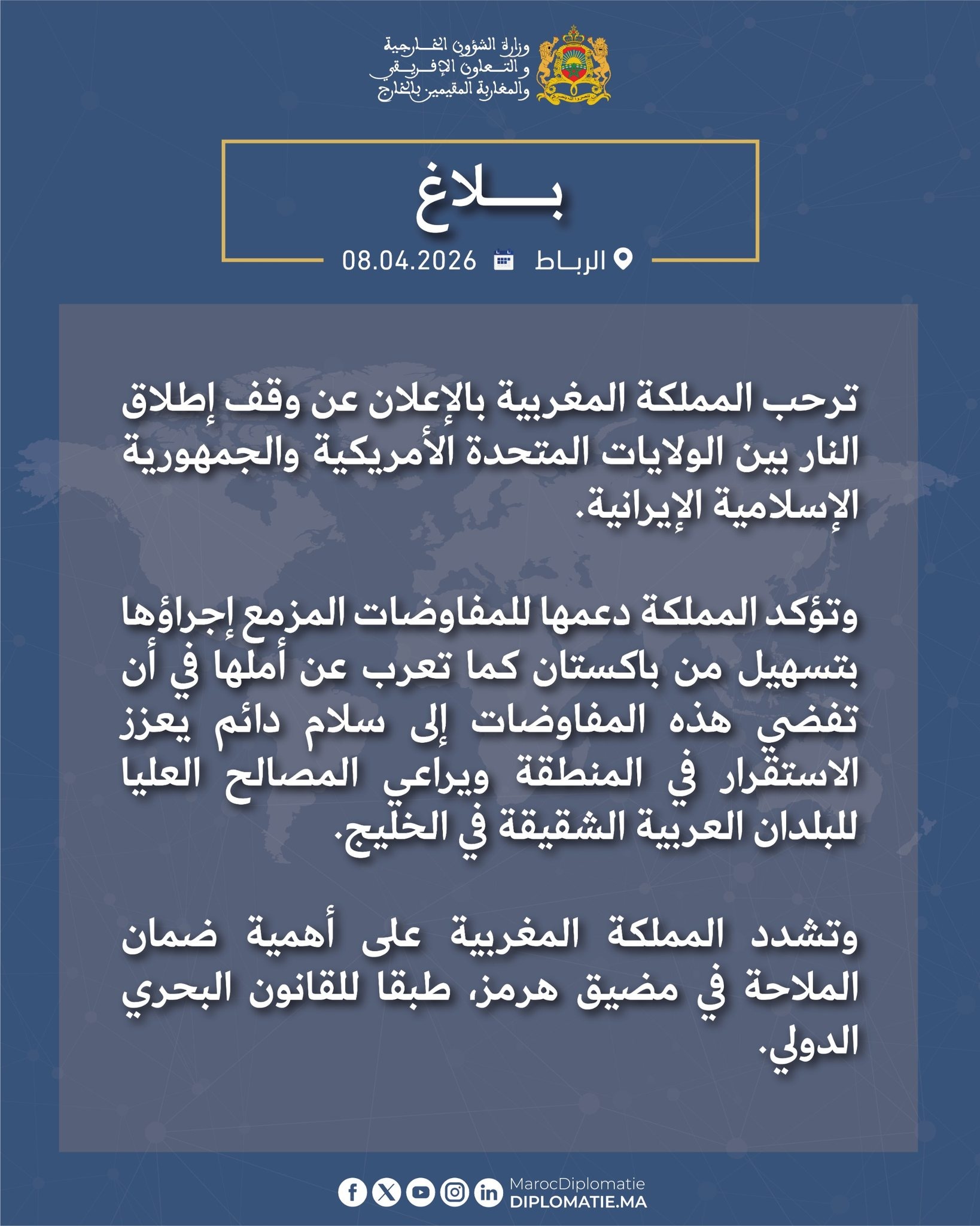 رحبت المملكة المغربية، اليوم الأربعاء، ( 8 نيسان 2026 )، بالإعلان عن وقف إطلاق النار بين الولايات المتحدة الأمريكية والجمهورية الإسلامية الإيرانية.