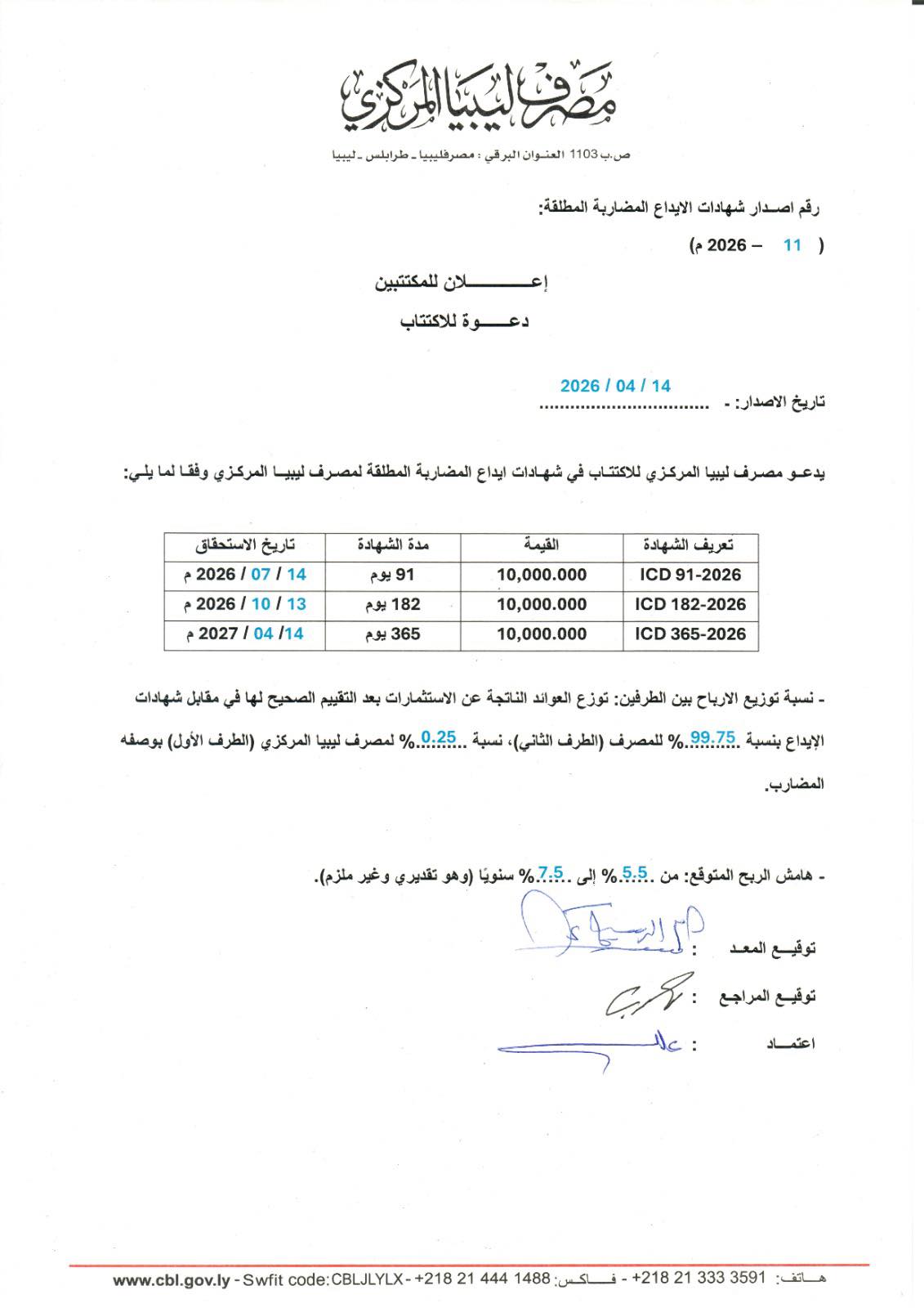 مصرف ليبيا المركزي يدعو المصارف للاكتتاب في إصدار جديد من شهادات الإيداع بعائد متوقع يصل إلى 7.5% سنويا