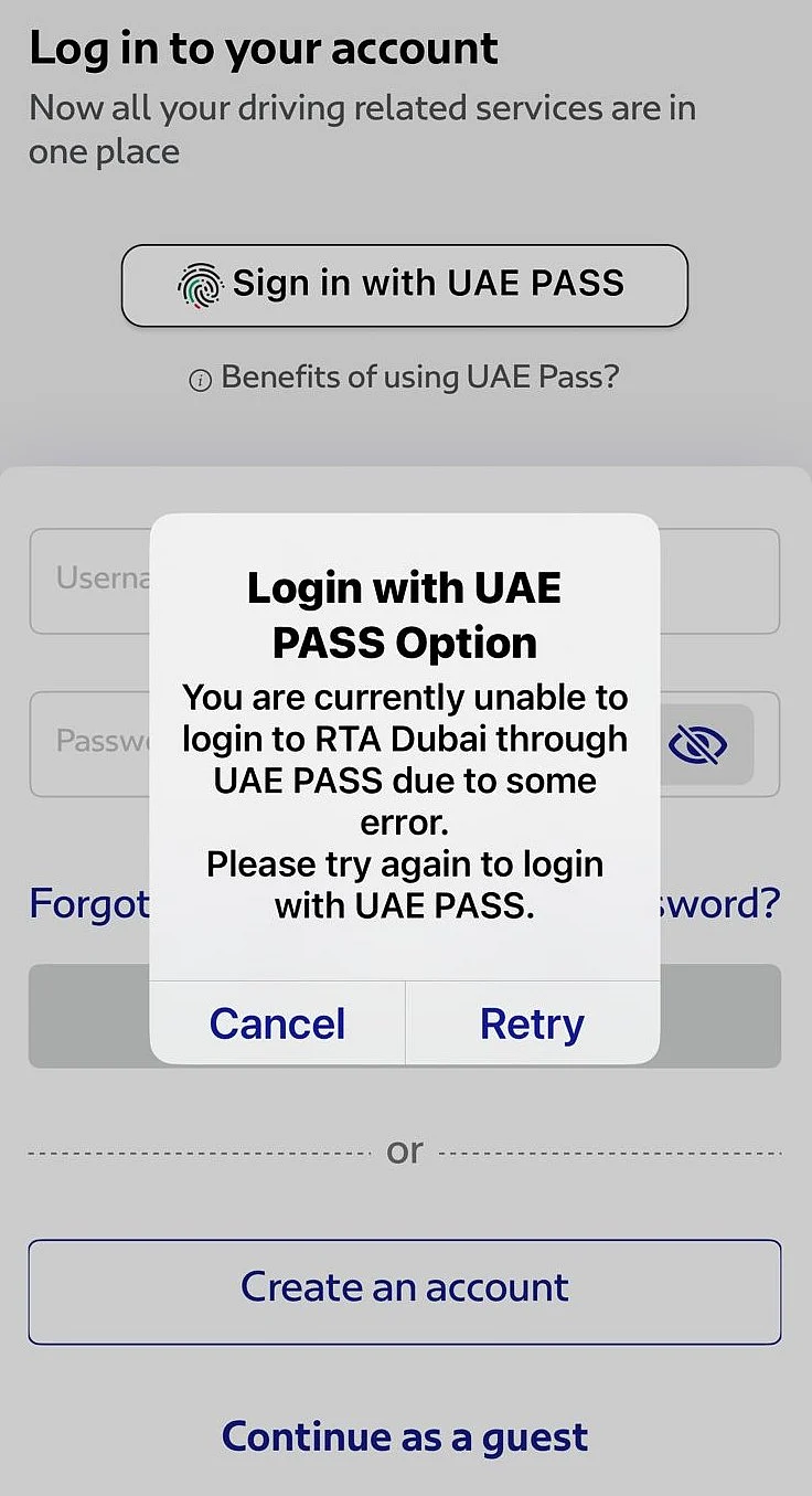 To alleviate these concerns, RTA said the issue is temporary and that its teams are working to resolve it. When trying to access the RTA app using UAE Pass, users get the following messages: