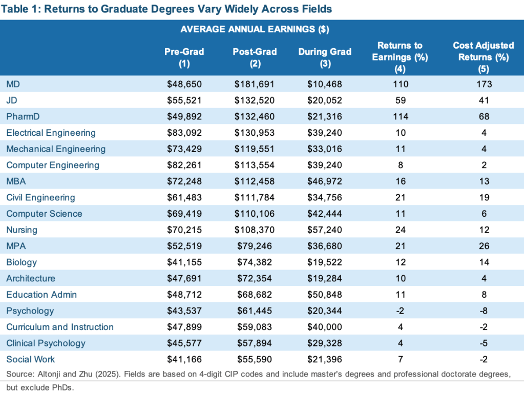 To be sure, graduate degrees overall do on average increase students’ earnings by around 17%, according to the researchers. And even as AI threatens to overtake law and business jobs, law degree and MBA holders still make 41% and 13% in cost-adjusted returns, respectively—solid returns, though still a far cry from the 173% returns a doctor of medicine (MD) degree offers. The greater than double returns of the MD come even after factoring in the average $228,959 students of medicine must pay to earn the degree.