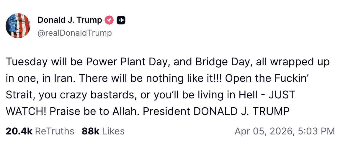 Trump threatened to “obliterate” Iran’s power plants if Tehran did not fully reopen the Strait of Hormuz within 48 hours, a significant escalation barely a day after he talked about “winding down” the war.