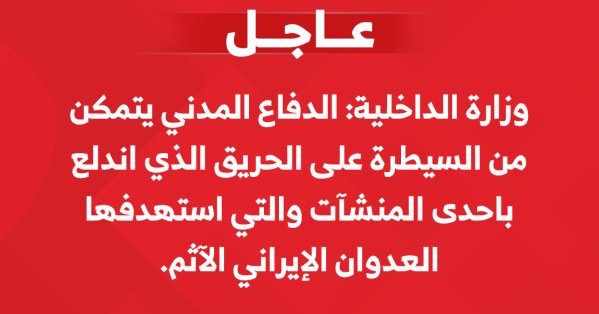 الداخلية: الدفاع المدني يتمكن من السيطرة على حريق بإحدى المنشآت جراء العدوان الإيراني الآثم