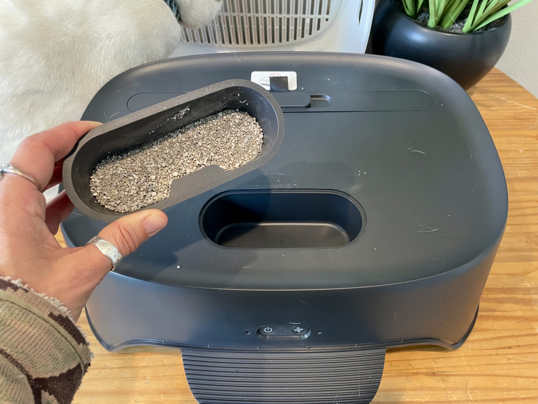 Under the removable grate is a flat surface with a removable cup in the center of one end. When I first saw this, I wondered whether the purifier’s vibrations might scatter the litter into the cup over time. After a week, I can tell you this is not the case.