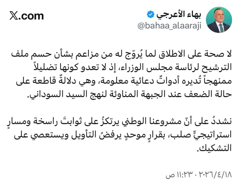 الأعرجي ينفي حسم ترشيح رئاسة الوزراء: دعاية مضللة