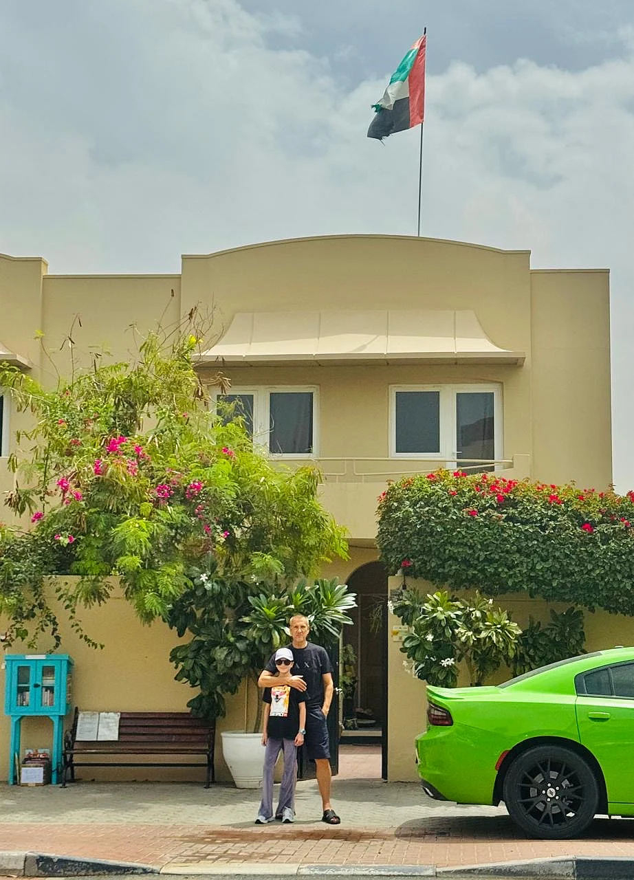 Kelly’s husband Alex Jeffries and daughter Aya Jeffries in front of their Jumeirah home
