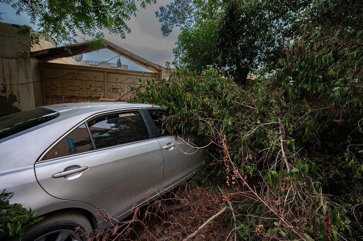 However, the situation remains unresolved as a fallen date palm behind the vehicle has blocked its exit. “Right now, I can’t even move the car because a big tree has fallen behind it. Once that is cleared, only then I can take it out. I’m just hoping it doesn’t rain again, otherwise it may cause damage,” Ramee added.