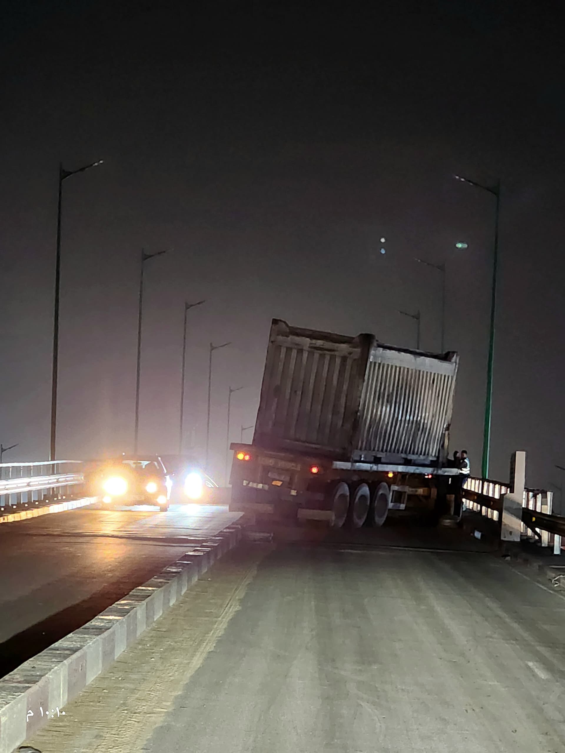 وسط ظلام دامس.. تعطل شاحنة فوق جسر الحي الساكن يشل حركة المرور