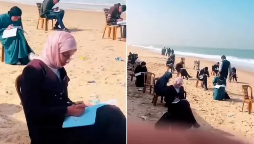 تداول ناشطون على مواقع التواصل، مقطع فيديو يظهر طلبة فلسطينيين في غزة، وهم يجتازون الامتحانات على شاطئ البحر، بفعل ما تعرفه المنظومة التعليمية في القطاع من انهيار جراء حرب الإبادة الإسرائيلية. وتفاعل المدوّن الفلسطيني خالد صافي مع الفيديو قائلا:”هدم المحتل المدارس، وقصف الجامعات، ودمّر المرافق...